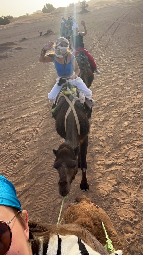 WOW! This was just two days of bucket list items back to back. We arrived and were shown how to tie our scarves in the traditional way and then assigned to a camel for our ride. Each camel is tied in a line of 8 and led by a human guide. The “saddle” is a metal cage with a bean bag balanced in between the two humps. It was not the most comfortable to be honest and I definitely made it worse by holding on for dear life for an hour straight. We took a two hour ride, getting off halfway through for the sunset, and arrived to our desert camp in the pitch black. This camp was not your average camp for sure. These were luxury tents with beds and a shower and a wooden door secured by a deadbolt. We were fed a wonderful dinner and breakfast here!